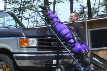 Private investigator Sarah Brooke sneaks innto the house. She gets out her cell phone and calls her boss saying that she’s entered the home and will let him know when she’s gotten the evidence. Sarah is confident she will get the proof to puut away the mob family. She assures her boss she has her taser so everything will be alright. Busty Sarah stalks around the house snapping pictures with her cell phone. She is clearly proud of herself and doesn’t even notice that I have entered the room. All of a sudden I grab the P.I. pushing her to the ground knocking the taser out of her hand. We struggle for the taser and Sarah tries mmightily to reach her trusty taser, but her fingertips are coming up short. I am able to get the upperhand and I get the taser and taze Sarah into submission. I pick up her phone and realize what is going on and I drag Sarah into the garage. I Sarah to strip off her clothing – every piece of it until she is fully nude. I admire her ripe body and laugh. I shove a huge sponge into Sarah’s mouth stuffing it fully and wrap a ton of layers of vet wrap around and around her head until she’s silenced. Guess what Sarah, your back up isn’t coming – I have your phone!! I bind Sarah’s arms behind her back and secure her wrists tightly then I connect her wrist rope to a hitch point and wrench her arms upward in a mean strappado. Sarah struggles and kicks while I add a tight crotch rope and bury it deep inside her bare pussy and ass. Then I bind her knees together. I fondle Sarah’s tits and run my hands down her nude bound body as I inform Sarah that I’ve invited my crew to have some fun with her. Sarah is barefoot in the strappado and I decide to fuck with her. I toss her precious cell phone on the floor at her feet. I tell Sarah that if she can get to her phone perhaps she can call for help!! I leave the bound investigator struggling and straining desperately trying to get to her phone.